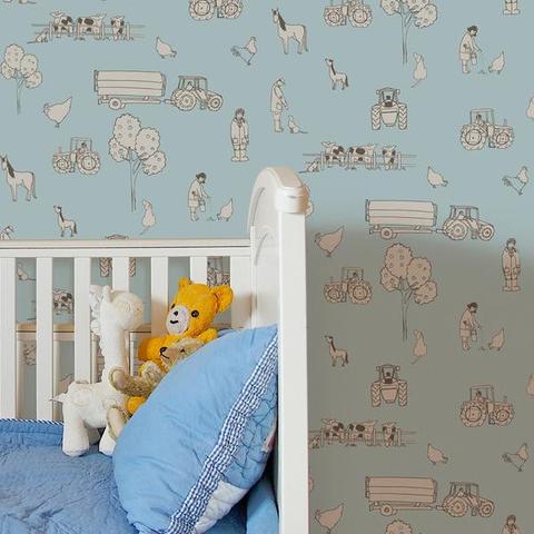 Katie Bourne Wallpaper | Cluck a Doodle Farm Cream & Blue
